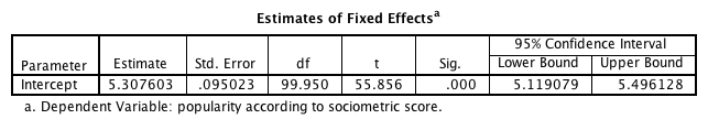 We can see that the fixed component of the effect, (γ00) is 5.308. This means that on average, schools had a student popularity of about 5.31, which is shown to be statistically different from 0, t(100) = 55.86, p < .001. But the question is: did schools differ as to the average popularity of their students. In essence, what we are testing is whether the variance of the random component is significantly different from 0. The variance of the random component is denoted by τ00 and residuals are denoted by σ2.