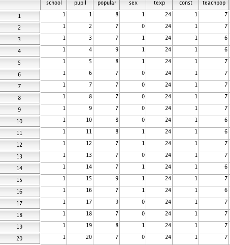 Suppose we have a dataset consisting of student popularity for a total of 2000 students from 100 classes. The table below shows the first 20 cases from this dataset. The outcome variable is popularity, which is a self-report rating on a scale from 0 (very unpopular) to 10 (very popular). Sex (0=boy, 1=girl) is the student level (level 1) predictor and teacher experience is a class level (level 2) predictor.