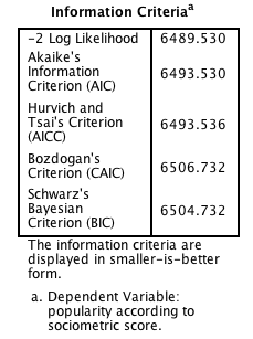 If there is little difference from from one school to the other on average student popularity then the variance across schools should be minimal or not at all. As can be seen in the Estimates of Covariance Parameters table above, the variance across all j schools (the μ0j’s) is τ00 = .871, which, according to the Wald Z test, is is statistically different from 0, Z = 6.817, p < .001.
